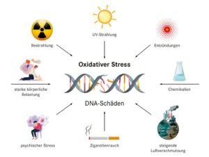 Wenn dieses Gleichgewicht gestört ist, z.B. durch Umweltgifte, Stress oder ungesunde Lebensgewohnheiten, entsteht ein Überschuss an freien Radikalen, der so genannte oxidative Stress.